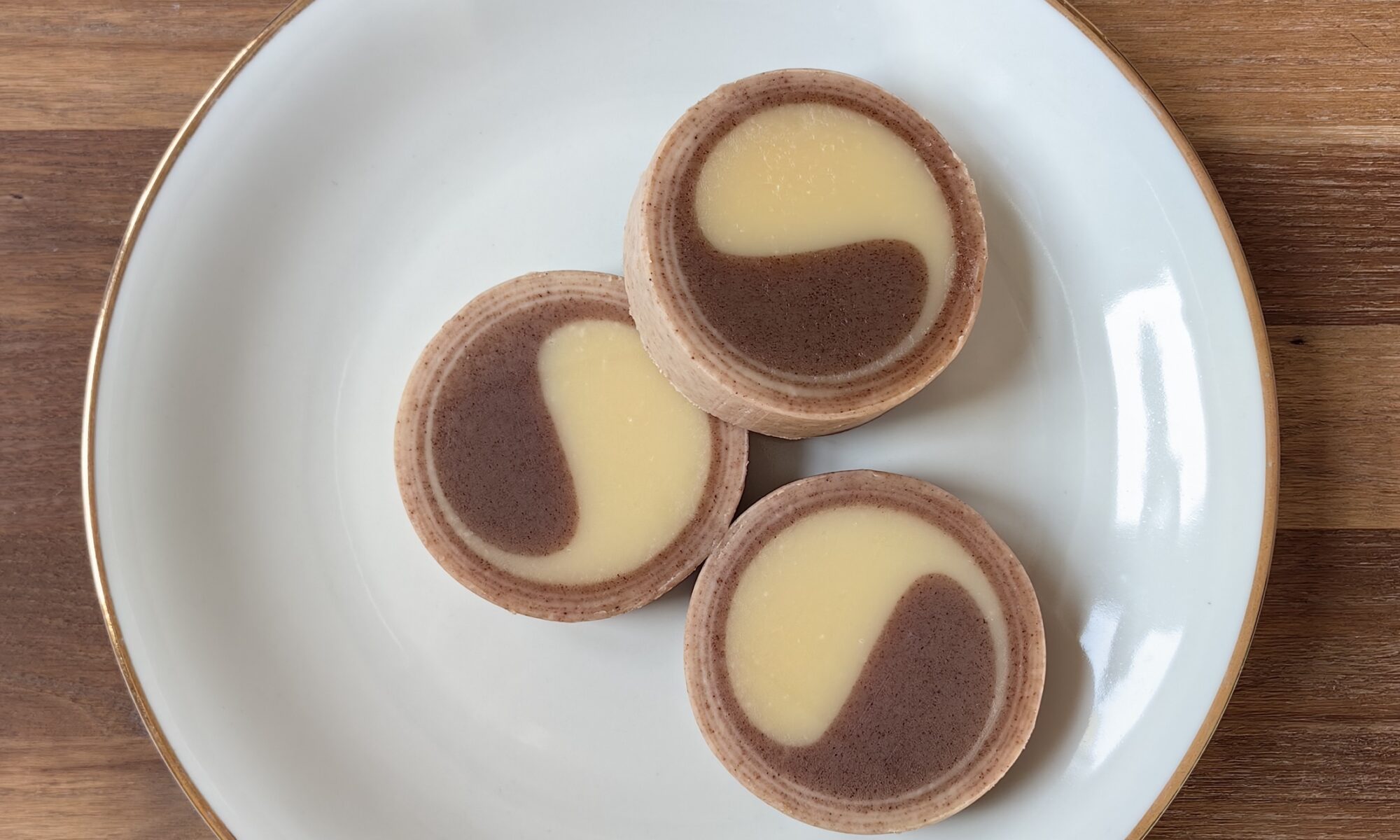 Ein Yin-Yang-Swirl ohne Drehteller. Die Idee einer Zimtrolle stand schon lange auf meiner Liste. Das Rezept hat sich mehr oder weniger von selbst ergeben, durch die ganzen Öle, die weg mussten. Eine Hälfte des Seifenleims habe ich mit Zimtpulver gefärbt (1 TL auf 250 g GFM), die andere einfach so gelassen. Wie oben schon erwähnt, …